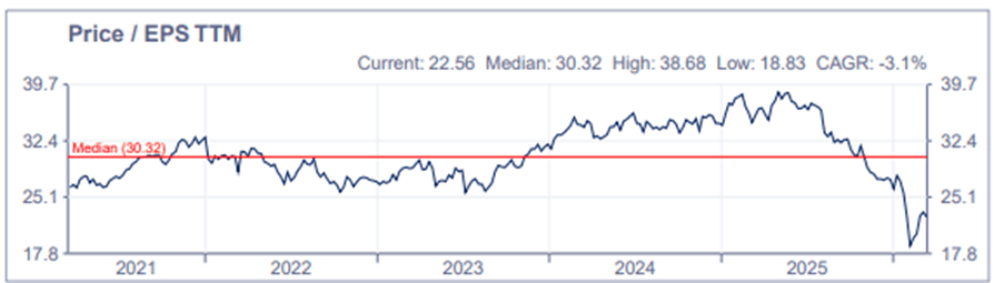 Over the past five years, the stock’s average (median) price-to-earnings ratio has been approximately 30. Based on its 2025 earnings per share (EPS) of 112p, it’s now under 23.